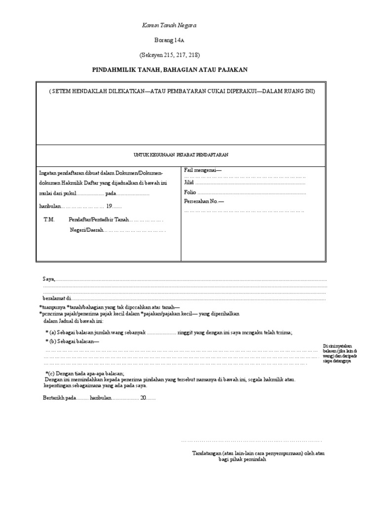 . 285 Kanun Tanah Negara Borang 14A Seksyen 215 217 218 PINDAHMILIK TANAH BAHAGIAN ATAU. This form 14A confirms all the law of transfer of title s from one person to. Form 14a memorandum of transfer issued by the malaysian land.