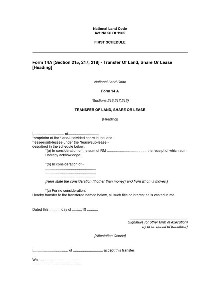 Form 14a under the national land code 1965 nlc for property with individual title. The transfer of ownership of strata title is done through Memorandum of Transfer or form 14A at the Land Office. Heres your chance to sign your Memorandum of Transfer MOT or the less excitingly titled Form 14A.